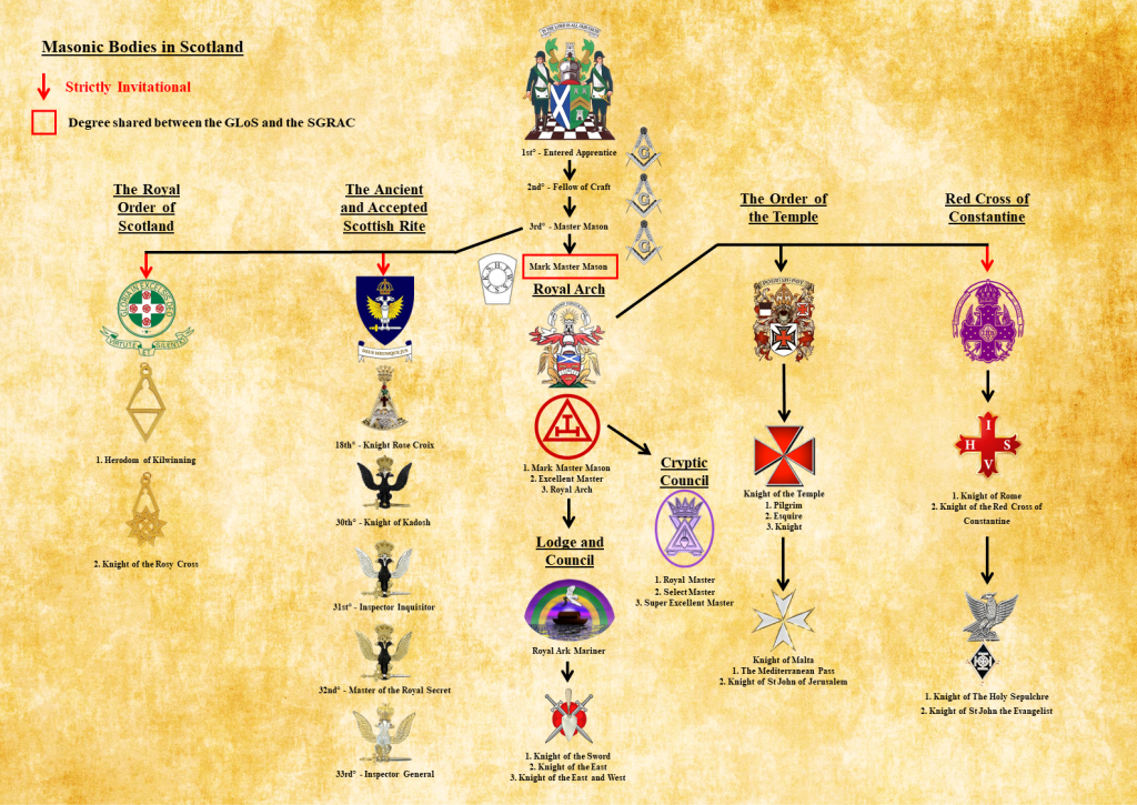 The following Bodies are Scottish Constitution based Orders. This graphic shows the pathways a Mason can take / be invited to take, after the Master Mason Degree in Craft Lodges.
